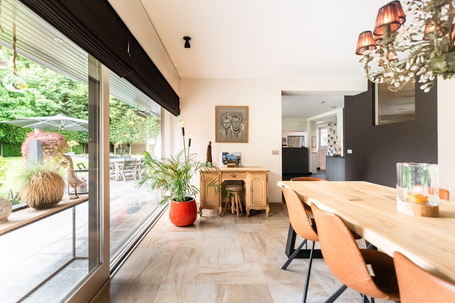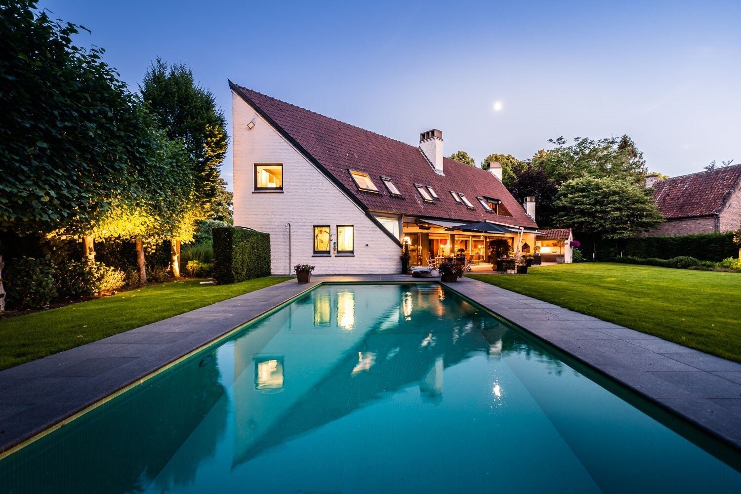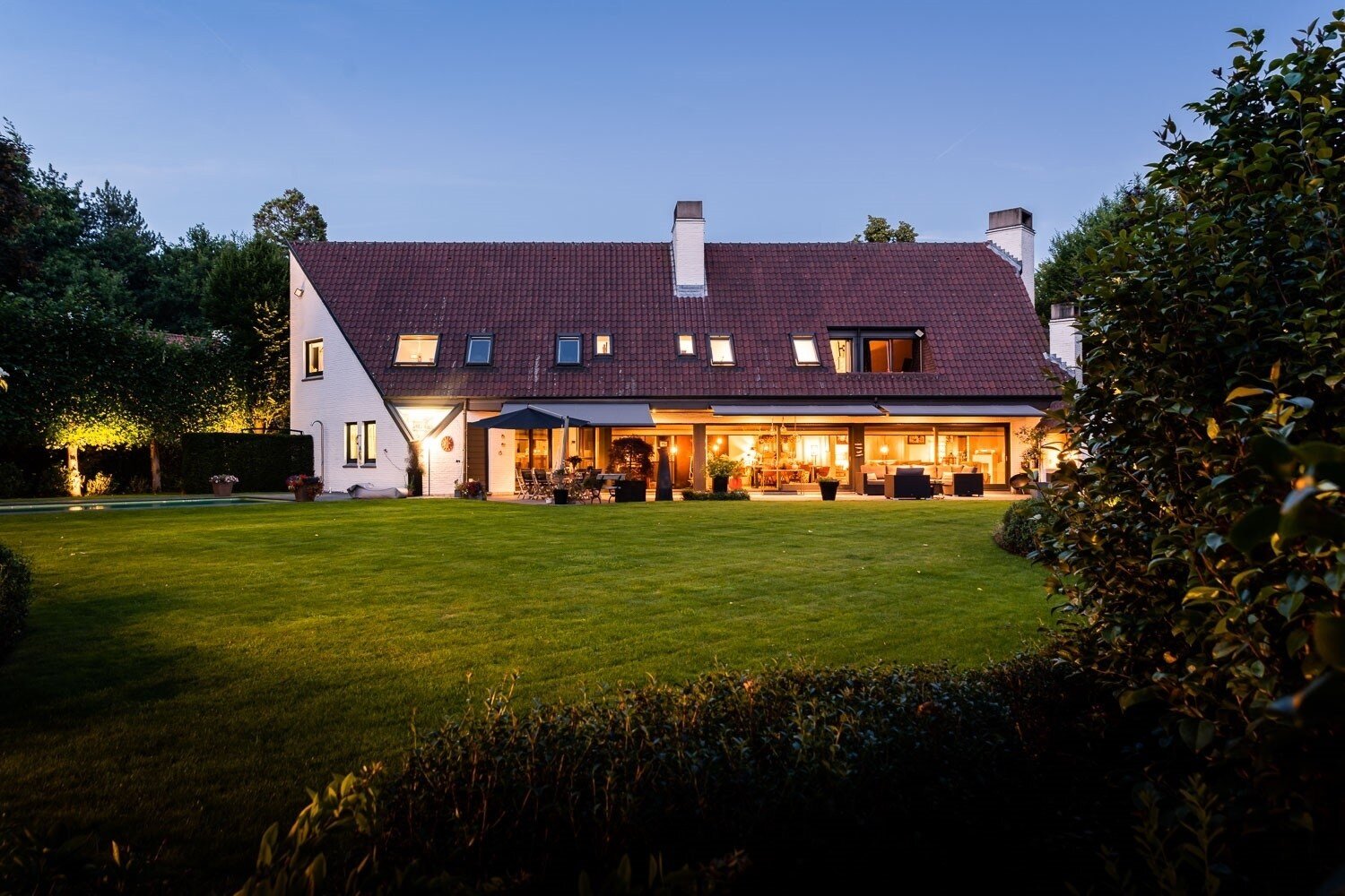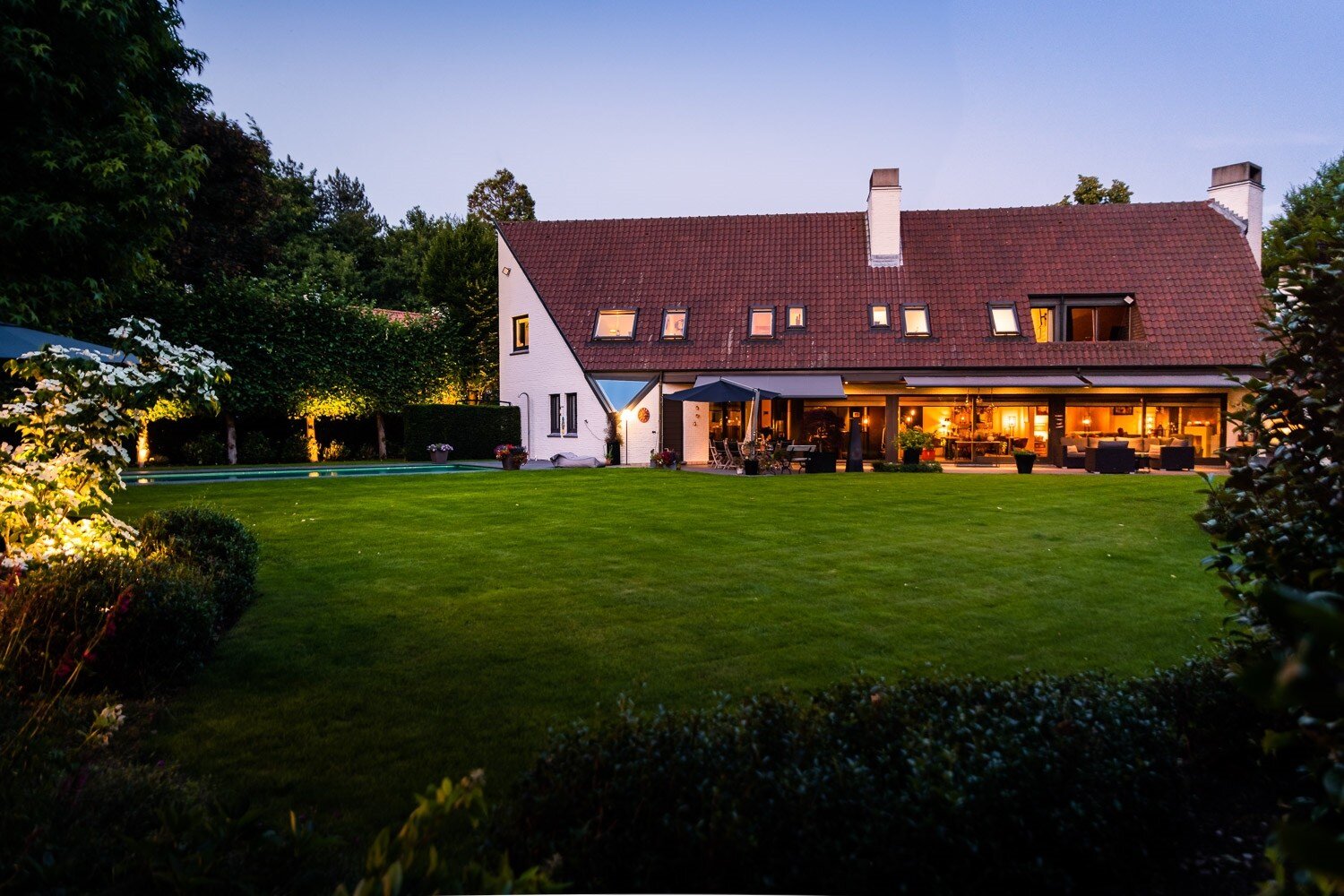De inkomhal verwelkomt u met een vestiaire en gastentoilet en leidt naar een elegante leefruimte met open haard, grote raampartijen en een prachtig uitzicht op de tuin en het zwembad. De eetkamer sluit harmonieus aan op de open leefkeuken, voorzien van een annex-bijkeuken. Alle leefruimten staan in directe verbinding met het terras en de tuin, waardoor binnen en buiten naadloos in elkaar overvloeien.
