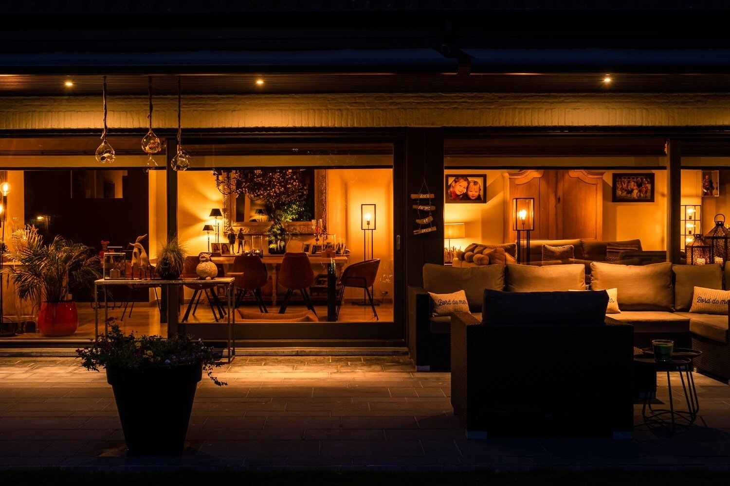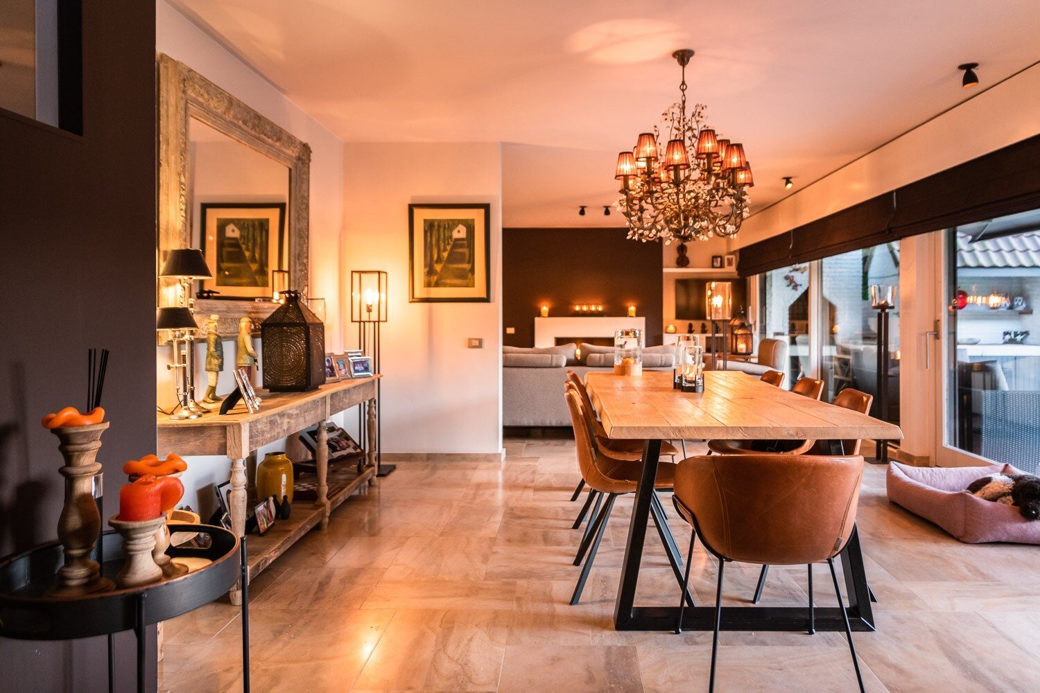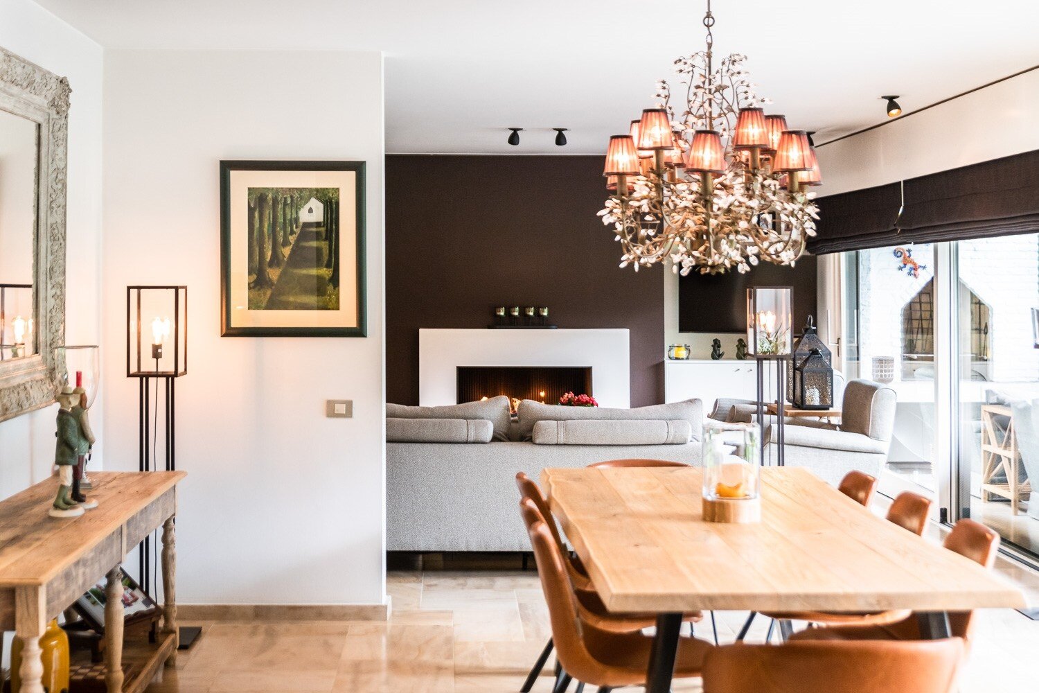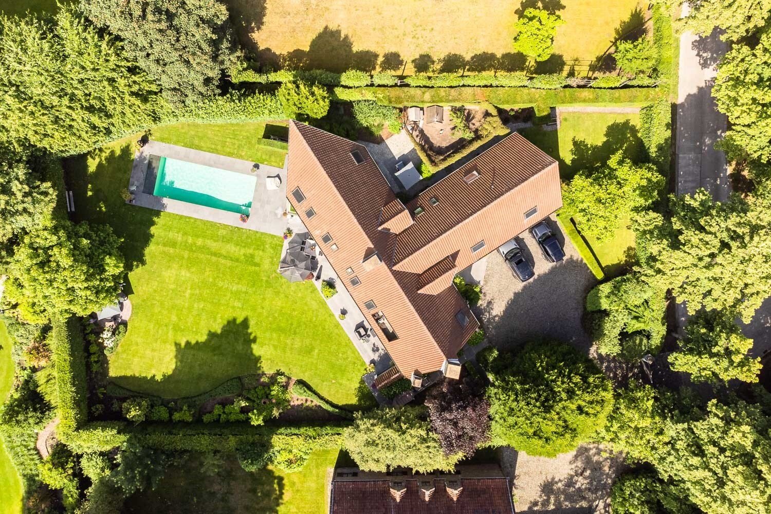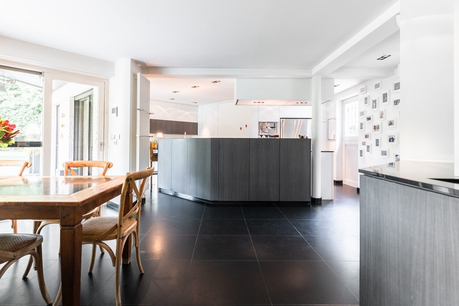 De inkomhal verwelkomt u met een vestiaire en gastentoilet en leidt naar een elegante leefruimte met open haard, grote raampartijen en een prachtig uitzicht op de tuin en het zwembad. De eetkamer sluit harmonieus aan op de open leefkeuken, voorzien van een annex-bijkeuken. Alle leefruimten staan in directe verbinding met het terras en de tuin, waardoor binnen en buiten naadloos in elkaar overvloeien.