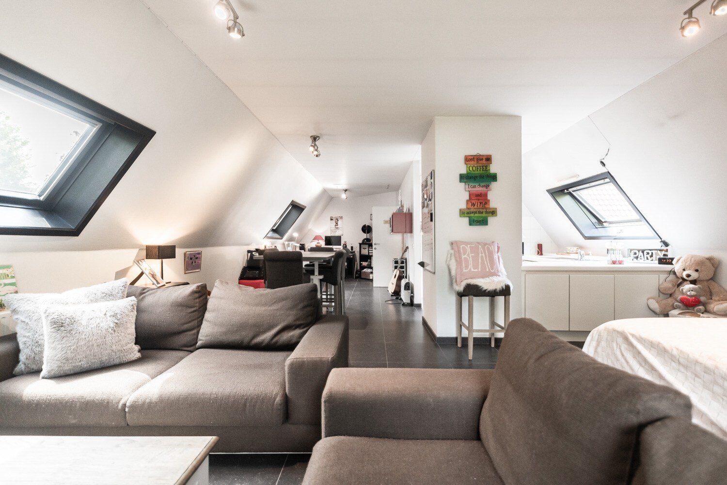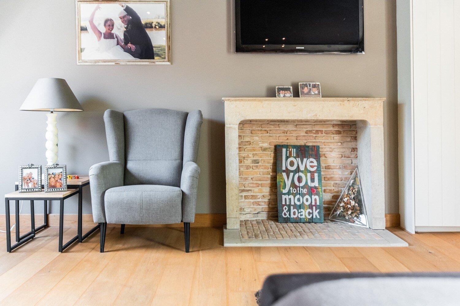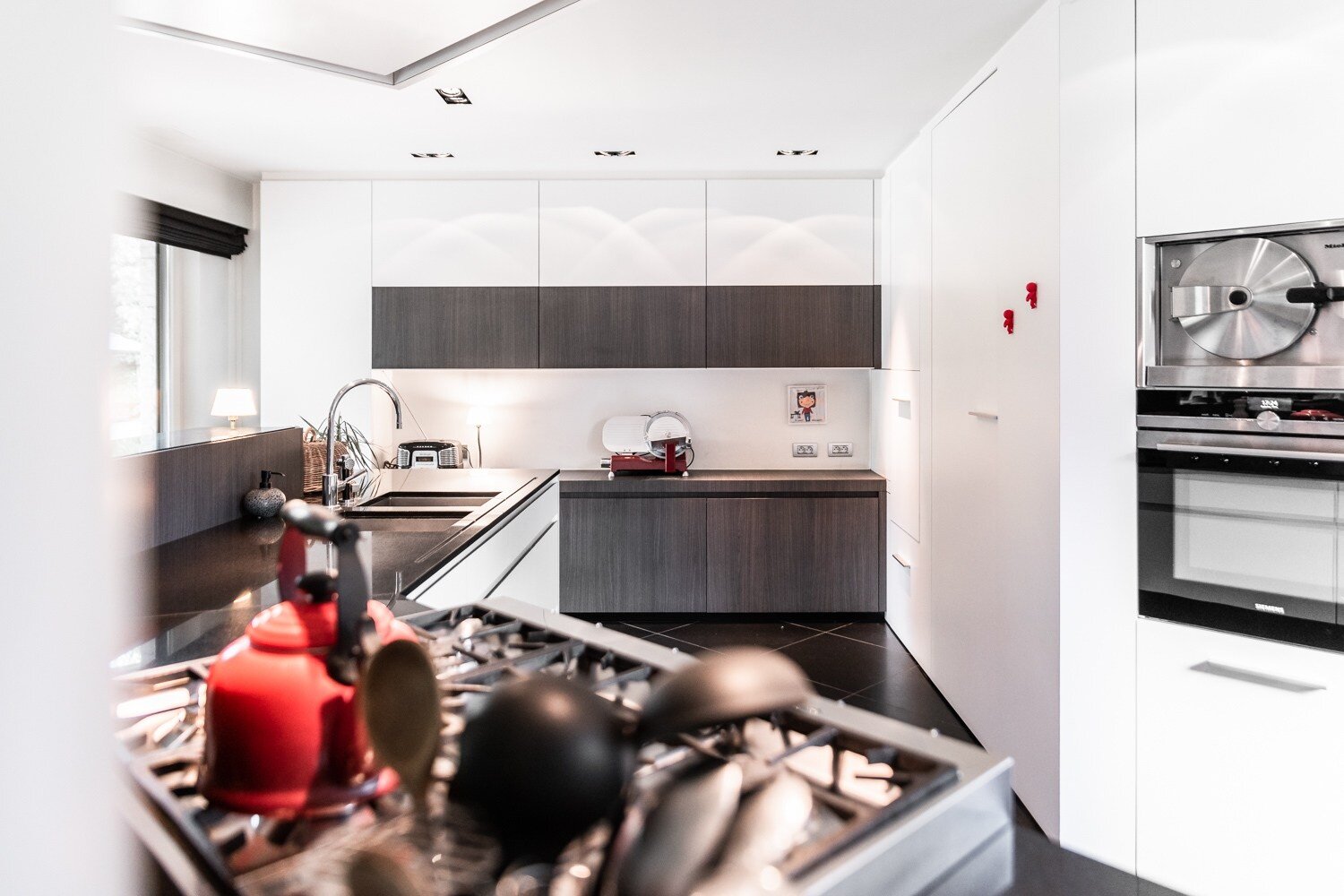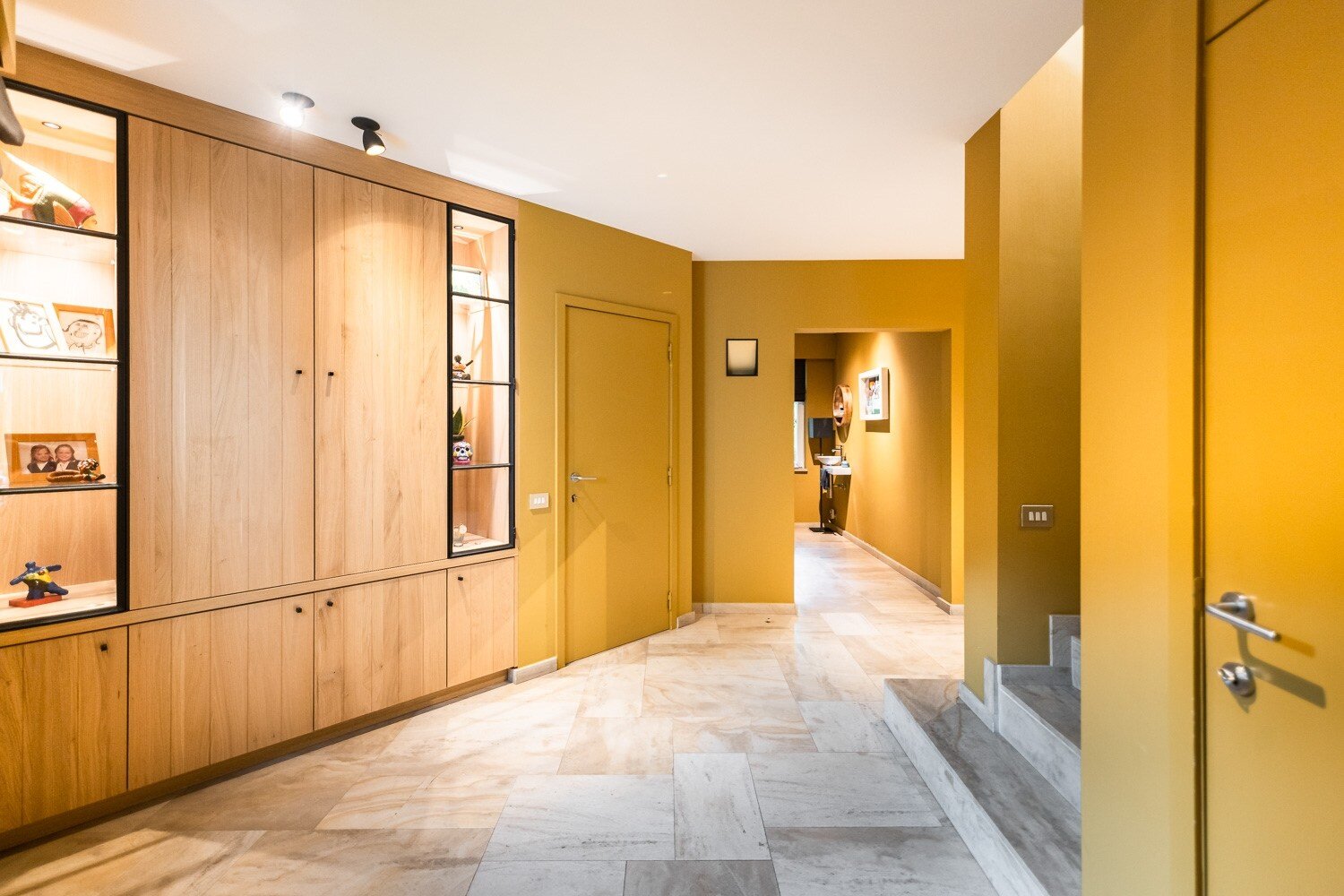 De inkomhal verwelkomt u met een vestiaire en gastentoilet en leidt naar een elegante leefruimte met open haard, grote raampartijen en een prachtig uitzicht op de tuin en het zwembad. De eetkamer sluit harmonieus aan op de open leefkeuken, voorzien van een annex-bijkeuken. Alle leefruimten staan in directe verbinding met het terras en de tuin, waardoor binnen en buiten naadloos in elkaar overvloeien.