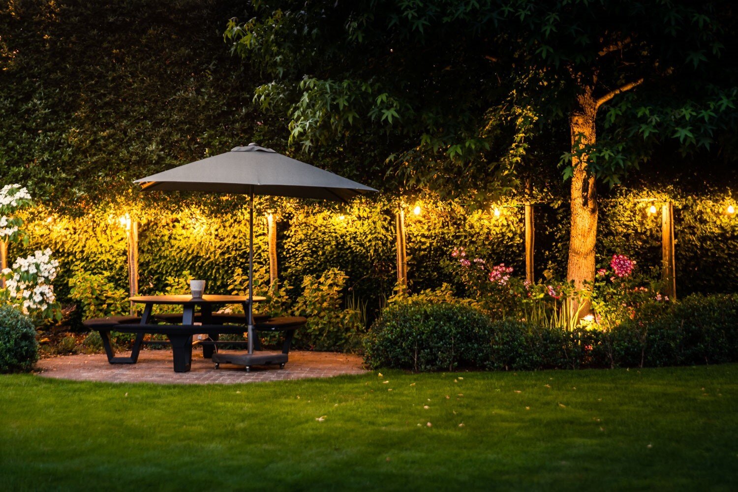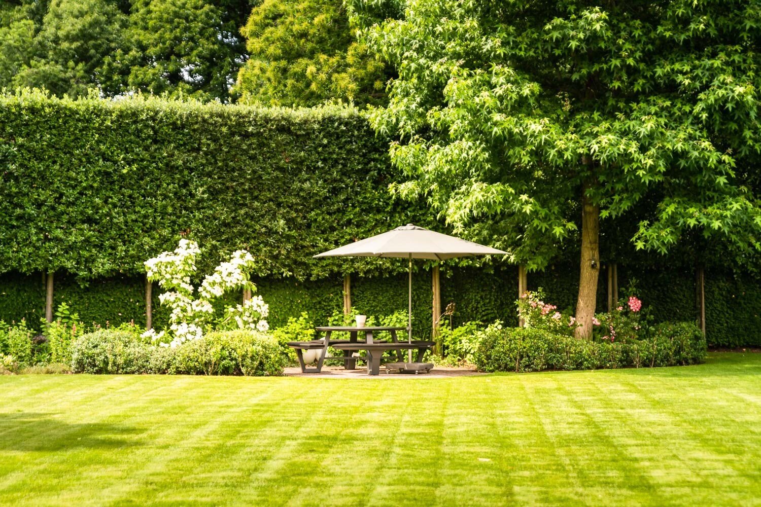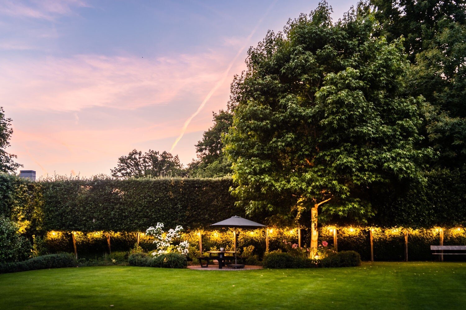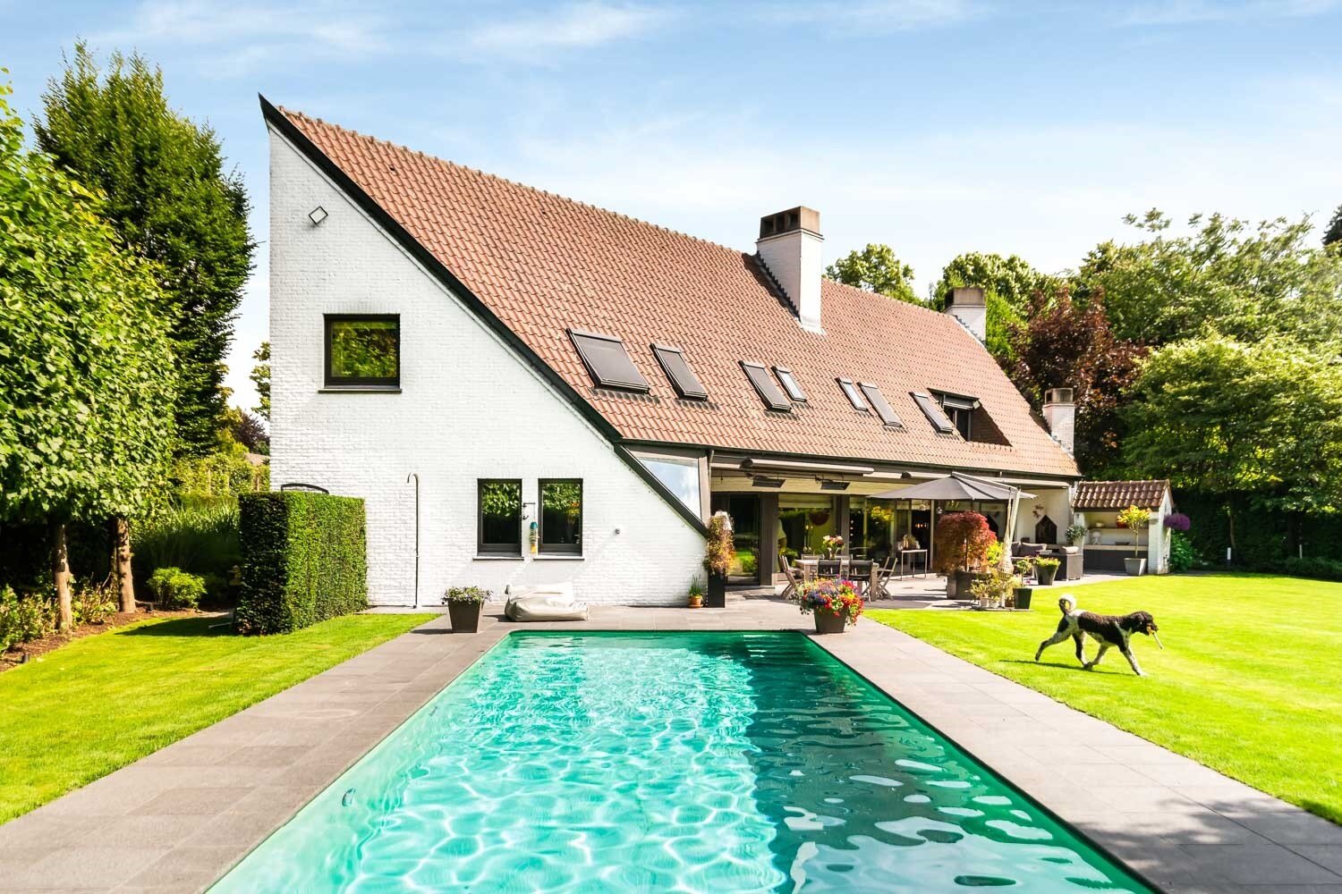De zuidgerichte tuin beschikt over een verwarmd zwembad en meerdere terrassen waaronder een overdekt terras met open haard en gasverwarmers.